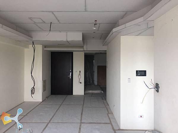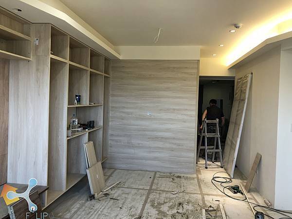 施工流程:梯間、地板保護 ▶ 水電、冷氣管線配置 ▶ 木作天花▶ 油漆 ▶ 燈具