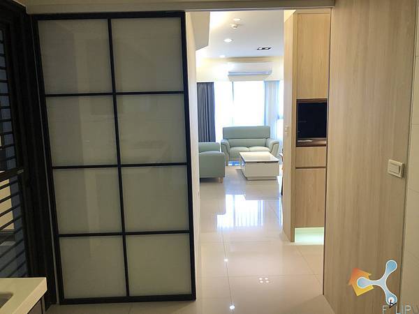 廚房入口新增的細框推拉門,不僅可將烹煮時的空氣隔離且增添設計感。