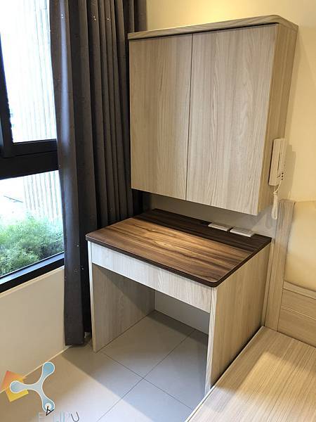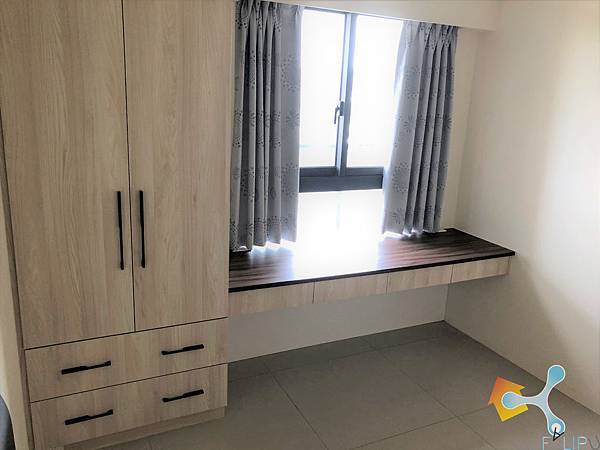 臥房將衣櫃與書桌結合,有效利用牆面收納並提供窗邊優良的閱讀空間。