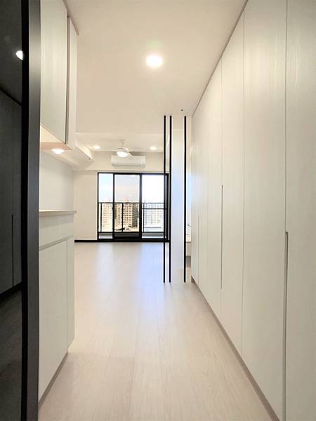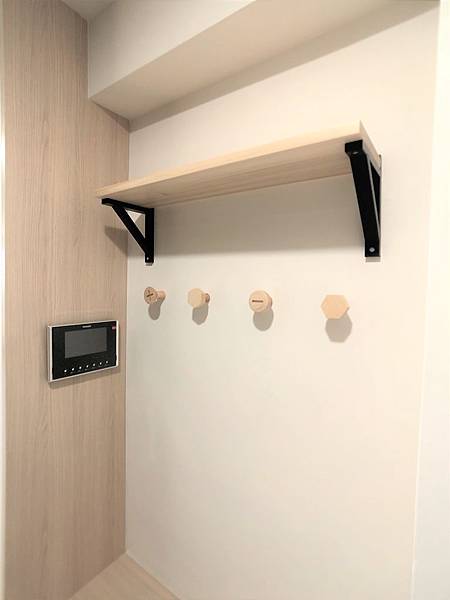 玄關觸壁面設置層板及掛勾,方便進出時,掛放衣物及隨身屋品。