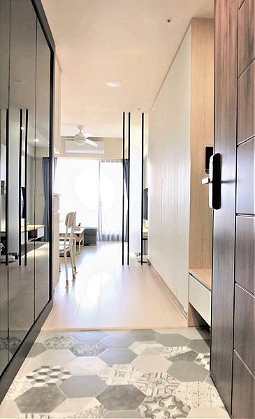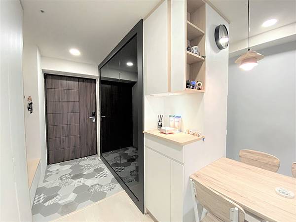 大面的灰鏡,方便出門前的衣著,視覺上同時也將原本的玄關空間延伸放大。