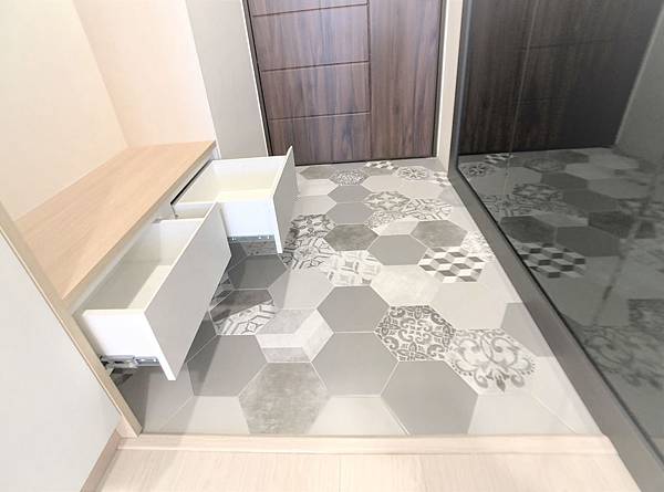 玄關入口懸吊矮抽,可坐在上方穿鞋,下方也可擺放鞋子 ,十分方便。