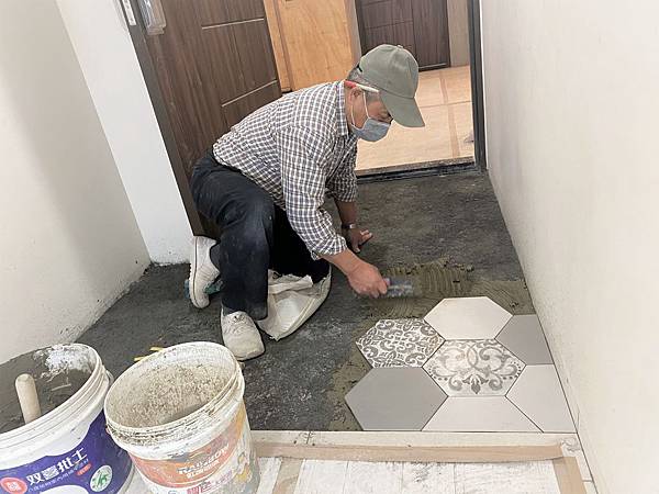 玄關入口處,將原地磚剃除,重新鋪設西班牙六角磚。