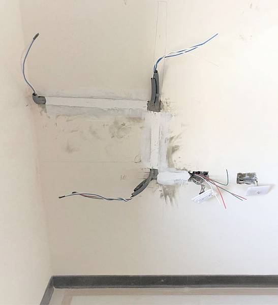 客製完美化妝桌的前置作業,壁面需精確放樣及配置線路。