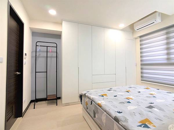 十分足夠的衣櫃牆,旁邊的鐵件掛衣架,也可以方便吊掛臨時衣物。