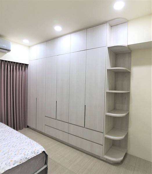 主臥衣櫃邊角設計採用開放圓弧,提供展示及臨時收納,降低進入時的壓迫感。