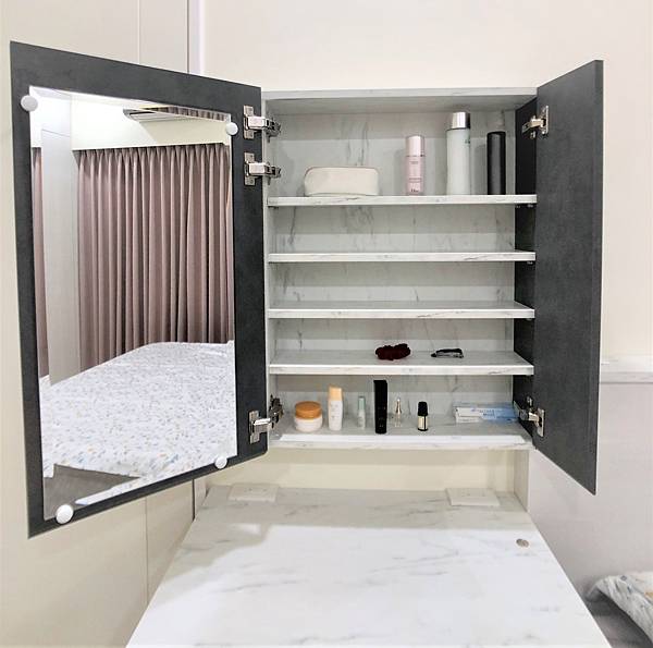 化妝櫃除設置大量收納化妝品空間外,還配置大面玻璃,方便梳妝。