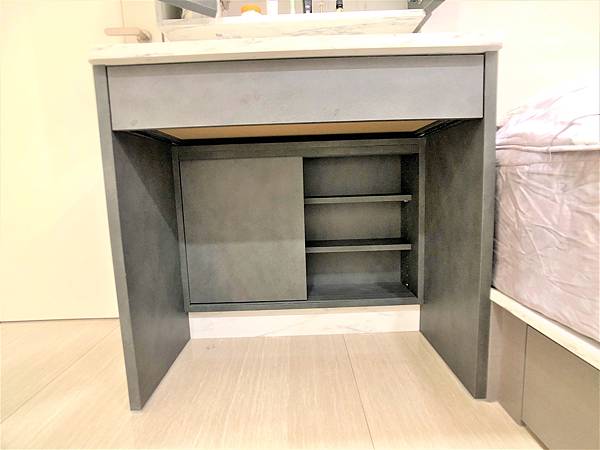 並在櫃下加設推拉門收納櫃,滿足化妝品收納的需求。