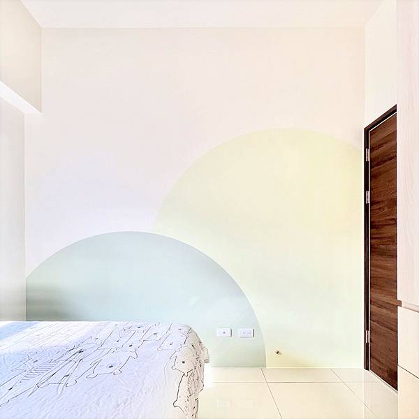 一進門規劃2座衣櫃收納,延伸過來床頭樑結合圓弧設計,化解壓樑。